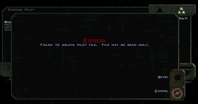 | Description | If I create a new multiplayer pilot, and click Remove, the following (dismissable) error appears: Error Failed to delete pilot file. File may be read-only. | ||||