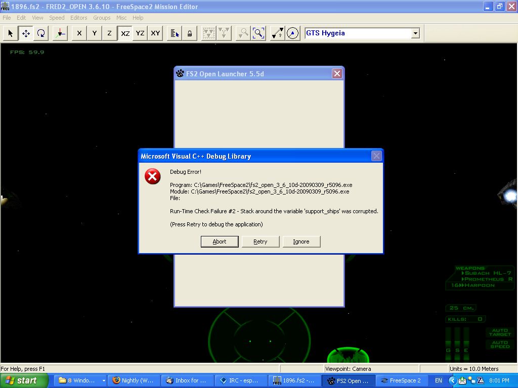 The problem occurs when you are using the ship class in a non support role. Try putting 2 in a mission. If it's not legal in game then FRED should catch it or it should crash a bit more gracefully. You have to alt-ctrl-del and end-task doesn't even work you have to stop the process. |