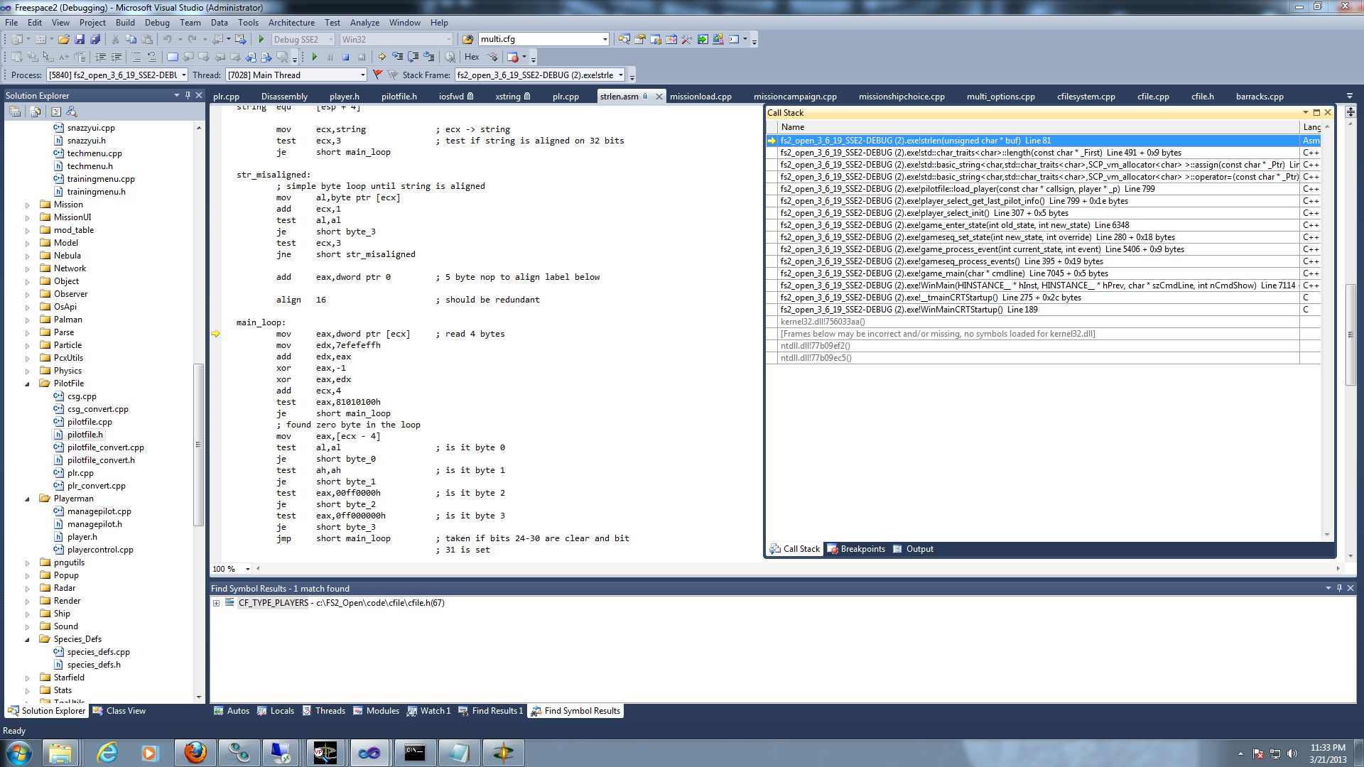 Getting a crash with this patch applied. Last call is from plr.cpp pilotfile::load_player() filename = callsign; filename += ".plr"; Beyond that it's into the library functions and finally assembly. Guess of a cause would be the line above where callsign is a bad pointer. Attached screenshot of the stack etc. |