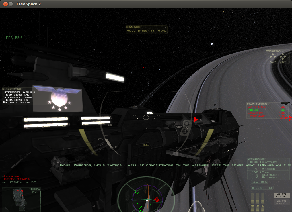 | Steps To Reproduce | 1) Compile a Blue Planet binary with latest trunk (tested with r10253) and BP.patch. I used these flags : ./autogen.sh CC=/usr/bin/clang CXX=/usr/bin/clang++ CFLAGS="-march=corei7-avx -O2 -pipe" CXXFLAGS="${CFLAGS}" make 2) Make sure to run Blue Planet war in heaven *without* the BP Compat VP files. Media VP 3612 mod is in use too. These are my settings : -mod blueplanet2,blueplanet,mediavps_3612 -missile_lighting -3dshockwave -post_process -fxaa -dualscanlines -orbradar -rearm_timer -ship_choice_3d -weapon_choice_3d -snd_preload -fb_explosions -fps -window -nograb -keyboard_layout "azerty" -spec_point 0.3 3) Go to mission simulator and run a mission where you can take a close look to a Karuna, especially exiting from subspace. I chose Delenda Est. At the begining of the mission, don't move, just watch the Indus exiting from subspace, to you left. It should present the issue. | ||||