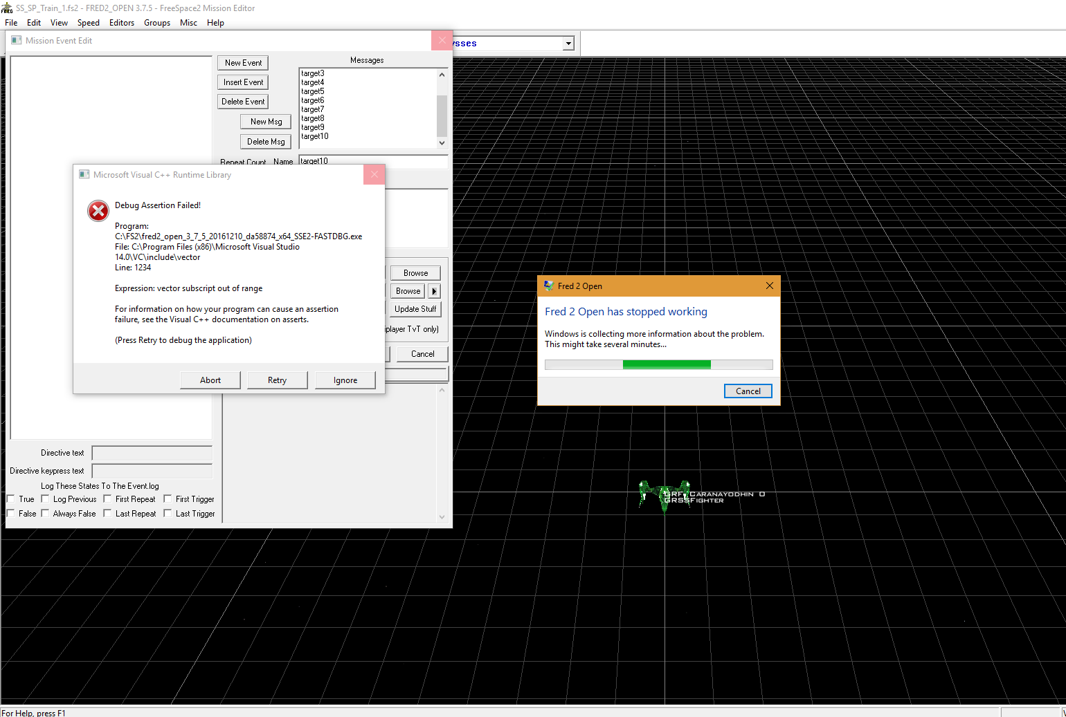 Okay, after trying again, this happens all the time with Debug FRED. No idling required. It'll happen all the time if you add a message and then click OK in the event editor. It may not be the same bug, but it is a bug. |
