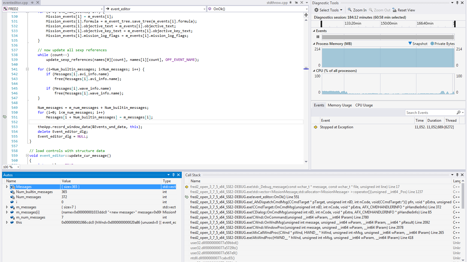 Attached a screenshot from Brian See, reported in this thread: http://www.hard-light.net/forums/index.php?topic=92943.0 This makes things more interesting. Just spitballing here - I wonder if the Event Editor is updating some sort of log, tally, or other vector-based structure, and leaving the window open for a long time causes the index to exceed INT_MAX. |