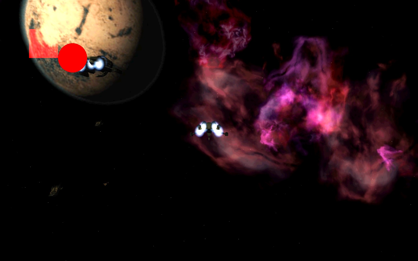 From tracing through the state with a debugger, it seems that the problem is indeed additive blending being used incorrectly. This is the stack when the external camera is enabled. (gdb) bt #0 opengl_setup_render_states (r=@0x7fffffffd87c: 127, g=@0x7fffffffd880: 0, b=@0x7fffffffd884: 0, alpha=@0x7fffffffd874: 255, tmap_type=@0x7fffffffd878: 1, flags=280, is_scaler=0) at graphics/gropenglstate.cpp:1251 0000001 0x00000000004e172f in opengl_tmapper_internal (nv=4, verts=0x2d021b0, flags=280, is_scaler=0) at graphics/gropengldraw.cpp:1279 0000002 0x00000000004e1e9d in gr_opengl_tmapper (nverts=4, verts=0x2d021b0, flags=280) at graphics/gropengldraw.cpp:1443 0000003 0x00000000007d6e11 in g3_draw_poly_constant_sw (nv=4, pointlist=0x7fffffffda20, tmap_flags=280, constant_sw=0.100000001) at render/3ddraw.cpp:466 0000004 0x00000000007db130 in g3_draw_2d_rect (x=100, y=100, w=100, h=100, r=255, g=0, b=0, a=255) at render/3ddraw.cpp:1718 0000005 0x00000000004d0b95 in gr_rect (x=100, y=100, w=100, h=100, resize=false) at graphics/2d.cpp:1470 0000006 0x00000000008fd308 in l_Graphics_drawRectangle_f (L=0x2996b80) at parse/lua.cpp:13021 0000007 0x00007ffff648b23c in ?? () from /usr/lib/x86_64-linux-gnu/liblua5.1.so.0 0000008 0x00007ffff6495d88 in ?? () from /usr/lib/x86_64-linux-gnu/liblua5.1.so.0 0000009 0x00007ffff648b64d in ?? () from /usr/lib/x86_64-linux-gnu/liblua5.1.so.0 0000010 0x00007ffff648a8d7 in ?? () from /usr/lib/x86_64-linux-gnu/liblua5.1.so.0 #11 0x00007ffff648b802 in ?? () from /usr/lib/x86_64-linux-gnu/liblua5.1.so.0 0000012 0x00007ffff6487361 in lua_pcall () from /usr/lib/x86_64-linux-gnu/liblua5.1.so.0 0000013 0x00000000007476ae in script_state::RunBytecodeSub (this=0x146c5e0, in_lang=1, in_idx=2, format=0 '\000', data=0x0) at parse/scripting.cpp:865 0000014 0x0000000000747854 in script_state::RunBytecode (this=0x146c5e0, hd=..., format=0 '\000', data=0x0) at parse/scripting.cpp:906 0000015 0x00000000007467ff in ConditionedHook::Run (this=0x29e64d8, sys=0x146c5e0, action=3, format=0 '\000', data=0x0) at parse/scripting.cpp:510 0000016 0x00000000007478e4 in script_state::RunCondition (this=0x146c5e0, action=3, format=0 '\000', data=0x0, objp=0x0, more_data=0) at parse/scripting.cpp:917 0000017 0x00000000004d0cd8 in gr_flip () at graphics/2d.cpp:1510 0000018 0x00000000004142eb in game_flip_page_and_time_it () at freespace2/freespace.cpp:3888 0000019 0x0000000000415777 in game_frame (paused=false) at freespace2/freespace.cpp:4513 0000020 0x0000000000416023 in game_do_frame () at freespace2/freespace.cpp:4816 0000021 0x00000000004182d8 in game_do_state (state=2) at freespace2/freespace.cpp:6498 0000022 0x00000000004c06ff in gameseq_process_events () at gamesequence/gamesequence.cpp:409 0000023 0x0000000000419172 in game_main (cmdline=0x2231360 "") at freespace2/freespace.cpp:7065 0000024 0x0000000000419372 in main (argc=1, argv=0x7fffffffe288) at freespace2/freespace.cpp:7199 (gdb) print gr_screen.current_alphablend_mode $12 = 1 (gdb) print gr_screen.current_alpha $14 = 0.5 Note the state of gr_screen.current_alphablend_mode & gr_screen.current_alpha. This means that this code is executed at code/graphics/gropenglstate.cpp:1230 which causes the colour change. (see the current value of the 1st param passed to opengl_setup_render_states, r=@0x7fffffffd87c: 127) } else { tmap_type = TCACHE_TYPE_NORMAL; alpha_blend = ALPHA_BLEND_ADDITIVE; // ALPHA_BLEND_ALPHA_ADDITIVE; // Blend with screen pixel using src*alpha+dst float factor = gr_screen.current_alpha; alpha = 255; if (factor < 1.0f) { r = fl2i(r * gr_screen.current_alpha); g = fl2i(g * gr_screen.current_alpha); b = fl2i(b * gr_screen.current_alpha); } So... next step is to hunt down what is setting this state in the external camera mode... ====================== Edit: Seems that gr_screen.current_alphablend_mode & gr_screen.current_alpha are only changed in gr_set_bitmap(), which is... unfortunate. In other words anytime a bitmap is set (for rendering later) the alpha can left in a state which can mess up the next rectangle to be drawn (and all the LUA onFrame hooks are run near last in each frame). Also, the reason why the alpha is OK when "inside the ship" is that the HUD (somehow, haven't traced it out yet) sets the alpha to 1 / off (somewhere inside game_render_hud(cid);) And lastly, drawCircle is fine because it ultimately calls gr_opengl_arc(), which doesn't use alphablend_mode / current_alpha to alter the colours. (speculation) maybe the solution is to create a new function for only drawing 2D rectangles without textures? The other option would be to mess with opengl_setup_render_states() and that seems a little more likely to have side effects. Unless someone can explain to me why "alpha_blend = ALPHA_BLEND_ADDITIVE;" is a good idea when you don't have a bitmap to draw to the rectangle |