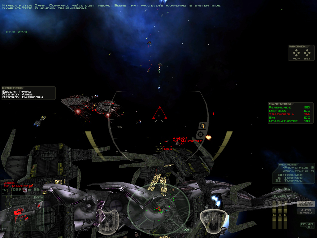 Well a double post but there were too many edits. I've played that mission for about 3 million times and: + I think blinking tends to happen when there are a lot of light sources (beams, explosions, and so on) BUT I'm not sure. + Without spec you get a greyish effect rather than a white one. (I upload two more screenshots). + (Edited). I nearly forgot. I've noticed that somtimes there are extremely increased brights within the SD Nyar... (I upload another two files). These lights are caused by damage electric discharges in the rear Ganimede Ring. But the effect is too intense. (I don't know if it can have some kind of link with the main bug, if it is just another bug, or if it is done in that way by design). edited on: 06-30-06 14:27 |
